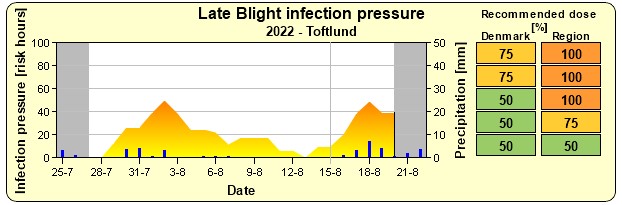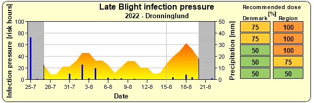 Handling: Undgå udbredt skimmel i afgrøden. Brug ”Skimmelstyring” til at vurdere risikoen for kartoffelskimmel. I perioder med kraftig nyvækst er det bedre at anvende reducerede doseringer i et kortere interval (5-6 dage) fremfor at øge doseringen i et længere interval. For høj N-tildeling giver øget risiko for angreb af skimmel. Brug gerne mere end tre frie år mellem kartofler for at nedsætte risikoen for jordsmitte.