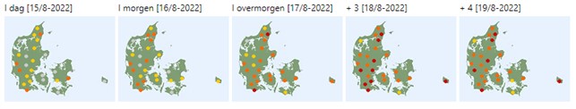 Der er i den kommende uge udsigt til fortsat varmt, men mere ustadigt vejr. Vi forventer dermed at skimmeltrykket kommer til at stige de kommende dage.