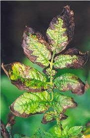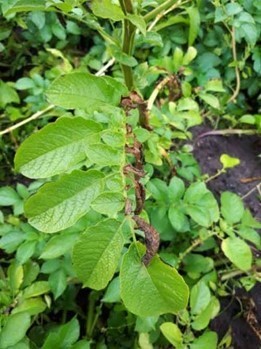 Billede 2 Symptomer på kransskimmel i en dansk stivelsesmark, hvor småbladene på halvdele af bladet visner, som følge af at kun enkelte ledningsstrenge blokeres.