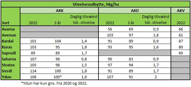 Prøveopgravningerne viser at stivelsesudbytterne i år generelt ligger over gennemsnittet for de 3 forudgående år. Særligt Ydun, Stratos og Avenue (kun i AKD) ligger højt. Bemærk at der er kun udbyttemålinger fra 2022 og 2020 i Ydun.