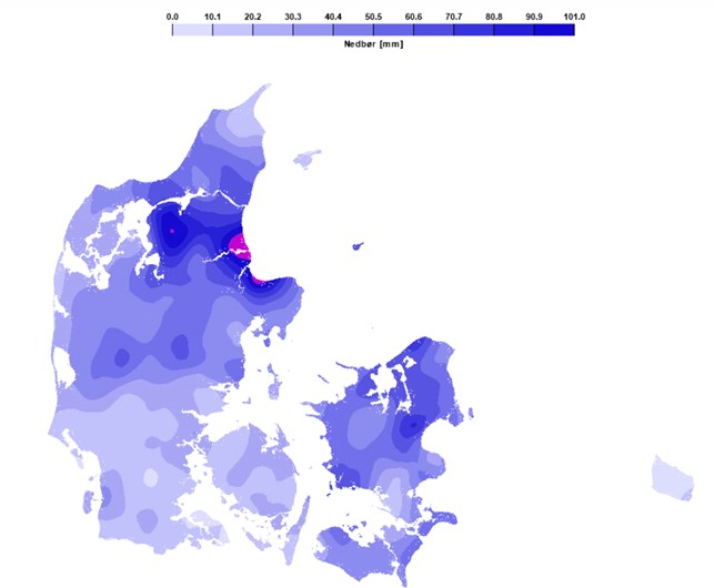 Billede 1 viser spredningen af nedbør fra d. 15. august og frem til nu. Lokale skybrud ved Sdr. felding har budt på omkring 200 mm nedbør.
