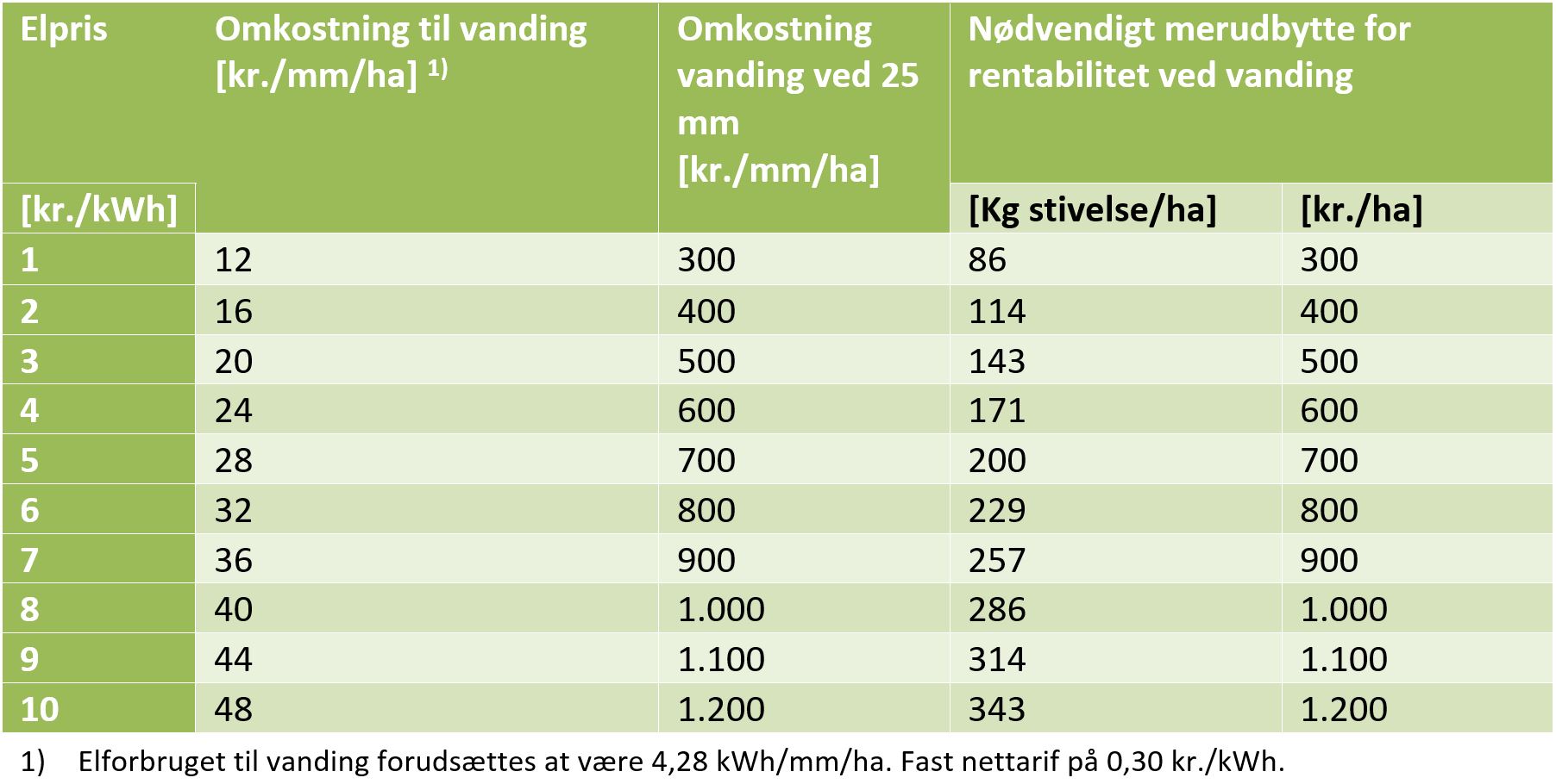 Spørgsmålet om vanding ved en elpris på 5-6 kr./kWh kan betale sig på nuværende tidspunkt, er der brugt data på baggrund af en artikel, lavet af Gunnar Schmidt, Byggeri & Teknik som også har været bragt i nyhedsbrevet Tilvækst. Klik her for at se hele artiklen. Kort sammendrag fra artiklen viser at det koster ca. 10 kr./mm/ha ved en elpris på 0,50 kr./kWh og ved en elpris på 1,50 kr./kWh er prisen ca. 14 kr./mm/ha. Dermed stiger omkostningen til vanding med ca. 4 kr./mm/ha, hver gang elprisen stiger med 1 kr./kWh. Nedenstående tabel er forsigtigt fremskrevet med de oprindelige beregninger fra Gunnar Schmidt. Tabellen er ikke fuldstændig retvisende, men viser prisrelationerne.