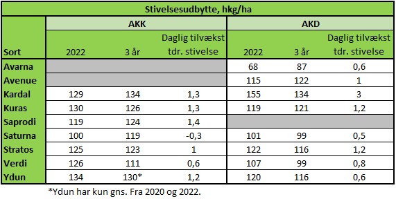 Tabel 1 Viser oversigt over stivelsesudbytter ved 3 prøveopgravning.