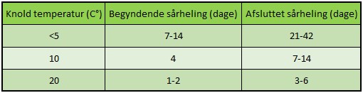 Tabel 2 Sårheling i relation til knoldtemperatur.