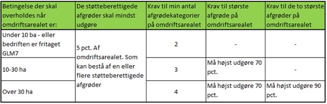 Tabel 3 Viser en oversigt over areal og antal afgrøder for at kunne søge tilskud til varieret planteproduktion.