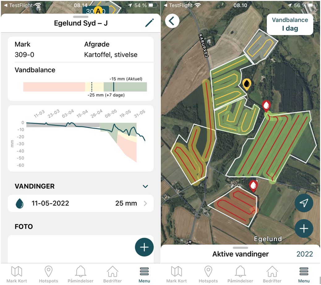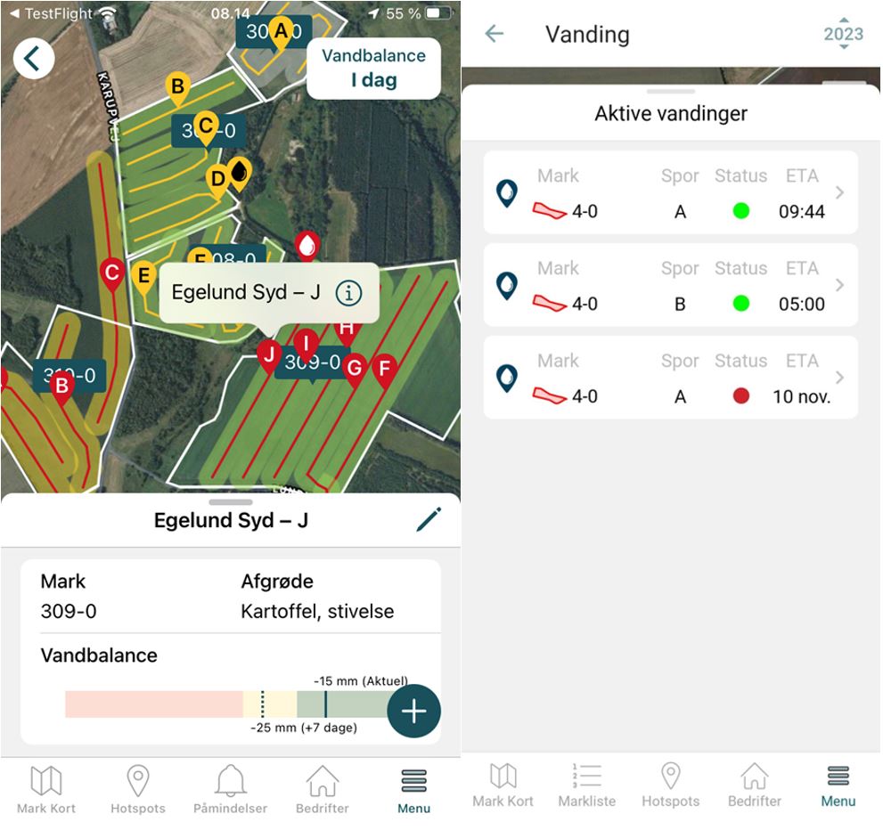 Til kommende sæson har SEGES lavet en udvidelse af Farmtracking, hvor det bliver muligt at indtegne boringer/pumpe og vandingsspor på de enkelte marker. For hver vandingsspor er der desuden tilknyttet en vandbalance, der viser afgrødernes vandingsbehov og som opdateres hver dag med aktuel fordampning og nedbørsdata. Hvis man registrerer de vandinger, man udfører i vandingsmodulet, så opdateres vandbalancen med den vandmængde, der indtastes og vandingsmodulet vil derfor kunne bruges som et vandingsregnskab, hvor man får et hurtigt og præcist overblik over, hvilke marker og i hvilke spor der er vandingsbehov.