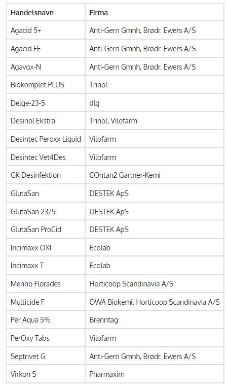 Tabel 1 Desinfektionsmidler med dokumenteret effekt over for plantepatogene mikroorganismer, herunder plantepatogene bakterier. Kilde: Landbrugsstyrelsen