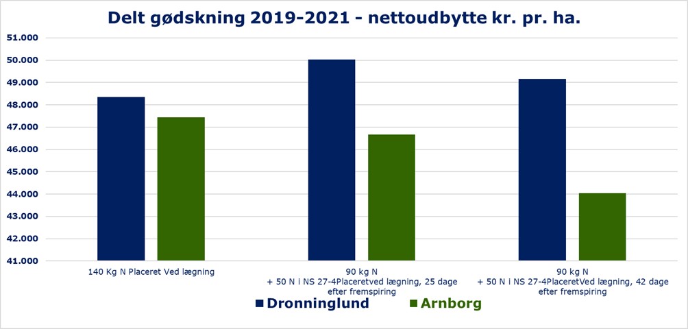 Der er de seneste tre år lavet forsøg med delt gødskning på forsøgsarealerne ved Arnborg og Dronninglund. Nedenfor er resultaterne fra alle tre år samlet i én figur. Vi ved at for lidt kvælstof fører til udbyttenedgang, men vi ved også at for meget kvælstof har en negativ effekt på stivelsesprocenten. Derfor er delt gødskning en god strategi. På trods af, at vi ikke ser den samme gode effekt af delt gødskning i Arnborg som i Dronninglund, er det vores klare anbefaling at man deler gødningen i to og eventuelt supplerer med bladsaftanalyser til at bestemme et eventuelt behov i slutningen af juni måned.