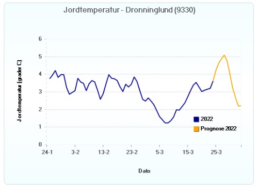 Figur 1 Jordtemperatur ved Dronninglund 25. marts. Kilde: www.landbrugsinfo.dk